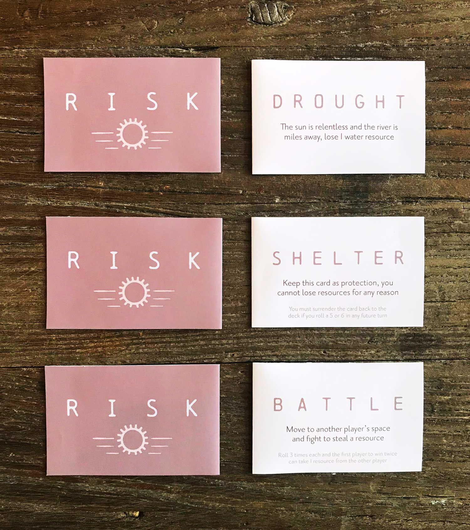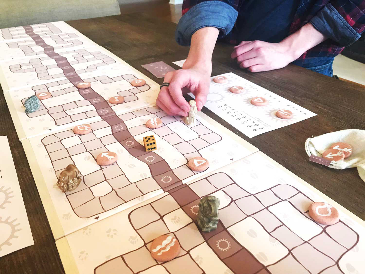 My solution is a flexible, resource-based game with unfixed board tiles. The game is played with four of the six board tiles at a time that can be arranged in any order, making up 24 possible board alignments. Players select from the four ceramic character figurines and strive to fill their resource cards with the required number of ceramic resource tokens arranged across the board tiles before reaching the river valley at the end. The game is randomized with a die and risk spaces that loom with a mixture of brutal punishments and lavish rewards. My illustrations within the game are inspired by prehistoric cave art and organic motifs and the tokens themselves were handmade from fired earthenware clay and paint. The color scheme is natural, based on earth pigments used in ancient art.
